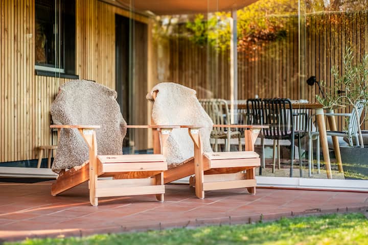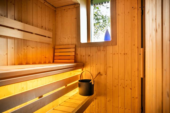 Entspanne dich mit dieser Ausstattung: Außendusche und Sauna.