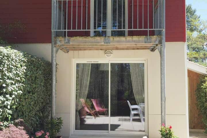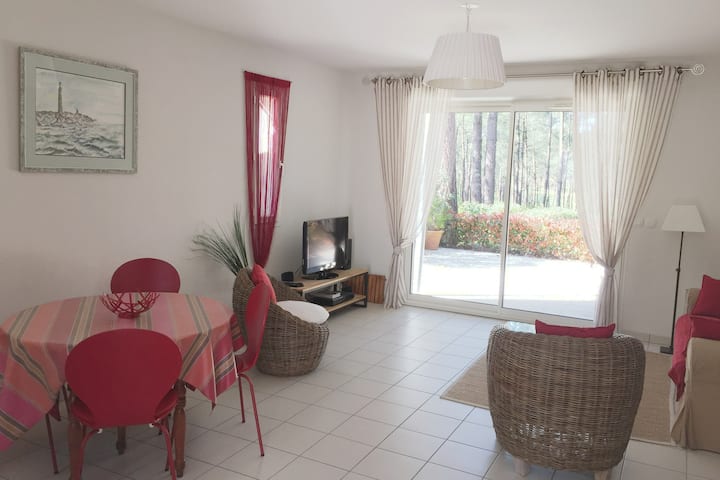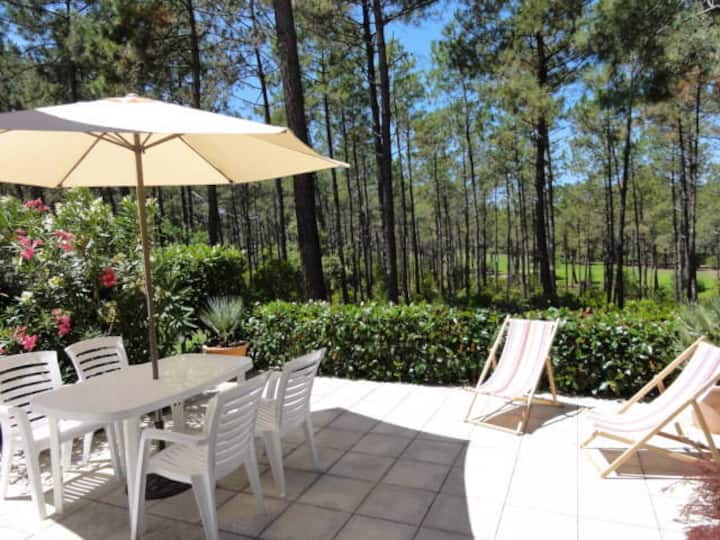 Zwischen See und Ozean , Haus 70m2 in den Pinien im Herzen des internationalen Golfplatzes des Ardilouse, dessen Terrasse das Loch 9 dominiert.
