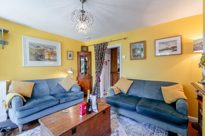 Betritt das sonnige Ferienhaus, um in seinem einladenden Wohn-/Esszimmer eine freundliche Begrüßung zu finden. Zünde in den kälteren Monaten hier ein Feuer an und entspanne dich dann in blauen Samtsofas, um die herrliche Wärme zu genießen. Wähle ein Buch aus dem Regal, finde einen guten Film auf dem Smart-TV oder höre deine Lieblingssongs über den Amazon Echo. Gehe durch die angrenzende Küche/Esszimmer, um den Wasserkocher für eine Tasse Tee aufzustellen, die du mit einem Stück frisch gebackenem Sussex-Wassail-Kuchen genießen kannst. Mit ihren mintgrünen Einheiten und Holzarbeitsplatten ist die Küche/das Esszimmer im Landhausstil auch gut ausgestattet, damit du deine Gäste mit Leichtigkeit versorgen kannst. Bereite dir eine Tasse Kaffee in der Maschine zu, um sie am Frühstückstisch hier zu trinken, oder setz dich zu formellen Mahlzeiten zurück im Hauptraum. Wenn der Tag zur Nacht wird, steige die Treppe hinauf in den ersten Stock des Ferienhauses. Hier findest du zwei entzückende Schlafzimmer mit Doppelbett, eines davon verfügt über ein kleineres Bett, sowie das Familienbadezimmer mit Dusche.