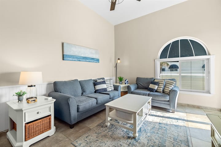 Tritt ein, um einen wunderschön gestalteten Wohnraum zu finden, der Komfort mit Küstencharme verbindet. Der offene Grundriss verbindet Küche und Wohnbereich und schafft eine einladende Atmosphäre für Entspannung und Zusammengehörigkeit.
