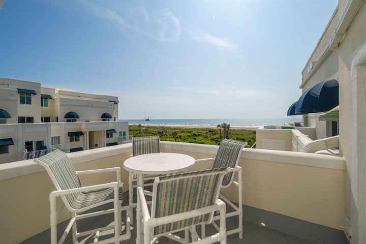 Willkommen in Royal Mansions, einer resortähnlichen Eigentumswohnung direkt am Strand in Cape Canaveral, Florida! Dieser Rückzugsort am Strand ist in beruhigenden Küstenfarben gehalten, die eine entspannende Atmosphäre schaffen. Genieße vom Balkon aus einen der besten Meerblicke des Komplexes, komplett mit einem hohen Esstisch, an dem vier Personen Platz finden – sicherlich ein Lieblingsplatz für Besucher. Diese Unterkunft bietet bequem Platz für bis zu sechs Gäste mit zwei Hauptschlafzimmern, die jeweils mit einem Queensize-Bett und einem zusätzlichen Kinderbett und einer Luftmatratze ausgestattet sind, falls erforderlich.