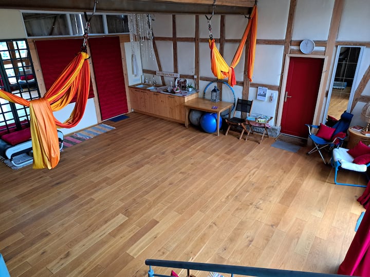 Eigentlich ist die Scheune der Herzstuck des Grundstucks. Jedenfalls es war das, weswegen die Fantasie, über was Kimmelsbacher Hof werden könnte, immer noch Flügel wachsen lässt, zu mal ich als Psychotherapeutin und Tangolehrerin mir gut vorstellen könnte hier zu tanzen.