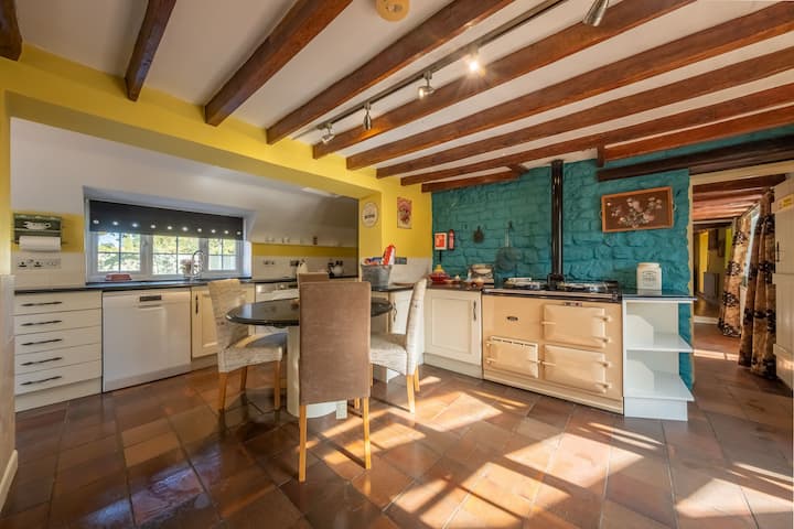 Ein schönes helles Dreierzimmer mit einer umfassenden Auswahl an Einheiten, einer schönen Landküche mit Granitarbeitsplatte und einer gemütlichen AGA. Das Zimmer verfügt über freiliegende Mauerwerke und Balken bis zur Decke und hat ein traditionelles Gefühl mit einem modernen Touch. Es gibt auch einen Neff-Doppelofen mit eingebauter Mikrowelle, fünf Ring-Induktionsherd mit Dunstabzugshaube, freistehender Kühlschrank mit Gefrierfach, Geschirrspüler, Waschmaschine und Trockner. Es gibt eine schmale Tür bis zum Esszimmer und verglaste Türen in den Gartenraum.