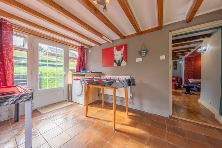 Mit einem kleinen Snooker-Tisch, einem Fußballtisch und einer verglasten Tür zum Garten. Es gibt geflieste Böden und einen Schrank, in dem sich der Wäschetrockner befindet.