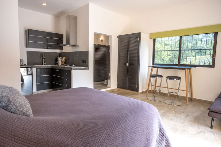 Dieses klimatisierte Studio hat alles, was du brauchst. Friedliche Ruhe im Baumkronendach des Dschungels. Es verfügt über schnelles Glasfaser-Internet (60 MB). Nur 5 Fahrminuten vom schönen Strand von Xpu-Ha, 5 Fahrminuten vom nächsten Supermarkt und 20 Fahrminuten vom Stadt Playa del Carmen entfernt. Dieses Zimmer bietet Platz für bis zu 4 Personen und verfügt über ein eigenes Badezimmer. Es verfügt über ein komfortables Queensize-Bett und ein Schlafsofa. Beide Betten befinden sich im selben Studiobereich nebeneinander. Das Schlafsofa ist ein kleines Doppelbett, also perfekt für 1 Erwachsenen oder zwei kleine Kinder. Es verfügt über eine voll ausgestattete Küchenzeile mit Kochfeld, Kühlschrank, Kaffeemaschine und Toaster. Es gibt einen großen, ruhigen Balkon mit einem Sitzbereich mit Blick auf die Cenote und den umliegenden Dschungel. Das Zimmer ist hell und luftig mit Deckenventilator und Klimaanlage). Moskitonetzfenster lassen eine gute Brise durch den Raum kommen. Der Zugang zu diesem Studio ist über eine Treppe.