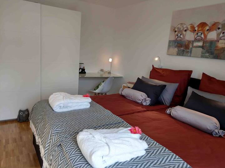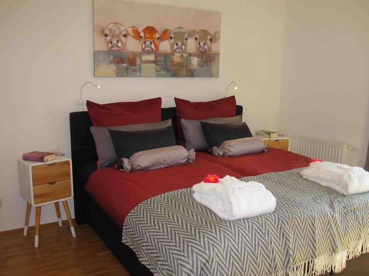 Sie wohnen hier in einem sehr schönen, 54 qm großen, gepflegten und luxuriösen Ambiente. Wir mögen dezente Farben, reduzierte Einrichtung und dennoch einen gewissen Komfort. Das alles bieten wir unseren Gästen in unserer Ferienwohnung, die wir mit viel Liebe und Sinn für Schönes eingerichtet haben, als ob wir selbst darin wohnen würden. Unsere Wohnung befindet sich in einer exklusiven Wohngegend.