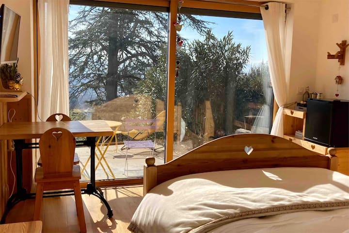 Charmantes Zimmer mit Blick auf den Garten mit Pool