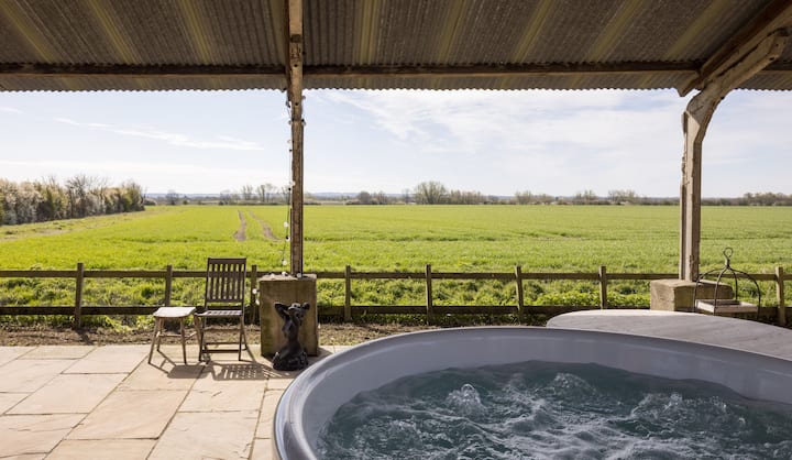 Unser großer privater Holz-Whirlpool mit Blick auf die Landschaft. Alle Gemeinschaftsbereiche, einschließlich unserer Grillmöglichkeiten, große holländische Scheune mit Picknickbänken und Blick auf die Landschaft und den Innenhof. Dieses Inserat ist für Amba, Annie und Marney Barns. Wenn du dich für einen Spaziergang auf dem Land entscheidest, stelle bitte sicher, dass du dich nur an öffentliche Fußwege hältst.