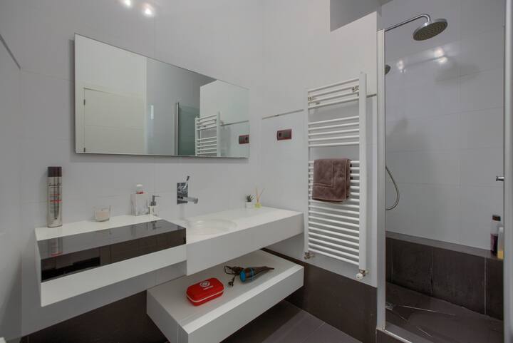 ✹ Volles Badezimmer: begehbare Dusche, Einzelwaschtisch, Handtuchheizung