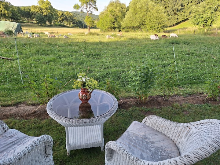 Wir sind 41 Jahre "alt" und betreiben seit 2007 den Ziegenhof mit Landschaftspflege. Mehrmals jährlich gibt es köstliche Salami, Schinken, Grillwurst von der Ziege und auf Vorbestellung zartes Zickleinfleisch. 2017 öffneten wir die erste Ferienwohnung "Geißlein" im Nebengebäude, die zwei weiteren ("Heidi" und "Ziegenpeter") folgten... Besonders einladend, neben den wohnungseigenen Balkonen mit Talblick, sind die idyllischen Gartensitzplätze rund um den Hof: