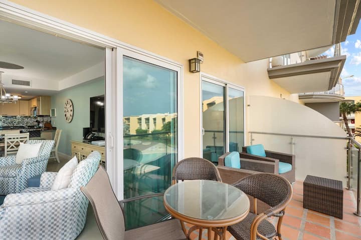 Genieße eine Aussicht, die deines wohlverdienten erholsamen Aruba-Urlaubs in der Wohnung Paradise View mit zwei Schlafzimmern gerecht wird. Diese Ferienwohnung liegt im Oceania Deluxe Beachfront Condo Resort, nur wenige Schritte vom weltberühmten Eagle Beach entfernt, der für seinen makellosen weißen Sand, das ruhige türkisfarbene Wasser und die atemberaubenden Sonnenuntergänge bekannt ist. Egal, ob du die perfekte Unterkunft für einen Familienurlaub, eine Reise mit Freunden oder eine romantische Auszeit suchst, diese Ferienwohnung ist das Richtige für dich. Der Balkon, der sich vom Hauptschlafzimmer und dem Wohnzimmer erstreckt, blickt auf den Resort-Pool, den beruhigenden Meerblick und genieße abends den Sonnenuntergang mit deinen Lieben.