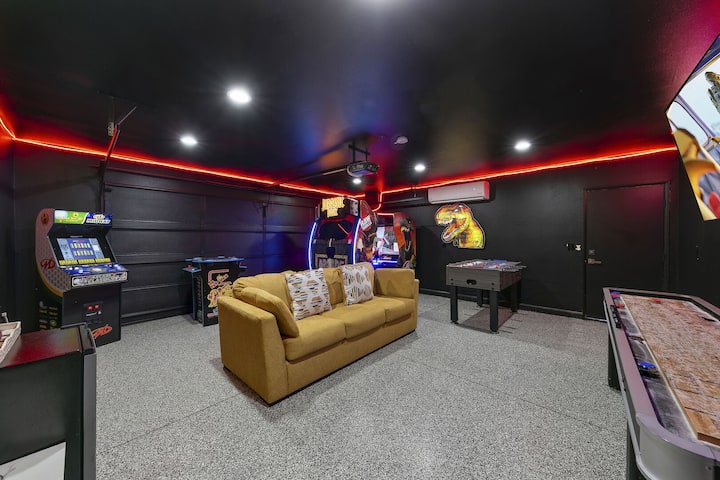 Weitere Annehmlichkeiten: Drahtloses Internet. Hochwertige Bettwäsche, Bade- und Poolhandtücher sowie ein Vorspeisenset mit L Occitane Shampoo, Spülung, Seifen sowie Toilettenpapier in jedem Badezimmer. Die Küche verfügt über ein Starter-Set Papierhandtücher, Spülmittel, individuell verpackten Schwamm und Geschirrspülerkapseln. Voll ausgestattete Waschküche mit Waschmaschine, Trockner, Bügelbrett, Bügeleisen und Wäschekapseln. Diese Unterkunft verfügt außerdem über Parkplätze für 4 Personen, darunter 2 in der Einfahrt und 2 auf der Straße, keine Garagenparkplätze. Das Haus verfügt auch über ein lustiges Spielzimmer in der Garage, komplett mit einer aufregenden Jurassic-Park-Arcade, einem Tischfußball, Shuffleboard, mehr klassischen Arcade-Spielen, einem Fernseher und einem eigenen Mini-Split-System, um die Dinge kühl zu halten, während die Konkurrenz sich aufheizt!