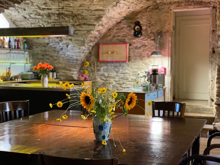 Wir heißen Gäste willkommen, diesen schönen Ort zu teilen, den wir zehn Jahre lang restauriert und entwickelt haben. Wir haben ein arbeitendes Künstleratelier mit Töpferplatte usw. für alle, die daran interessiert sind, viel angelegter Garten und eine Tischtennisplatte in der Hauptscheune. Es gibt auch ein buddhistisches Kloster namens Waldkloster Muttodaya, nur 20 Gehminuten durch den Wald von unserem Haus entfernt, wo Besucher an den täglichen Abendmeditationssitzungen teilnehmen können.