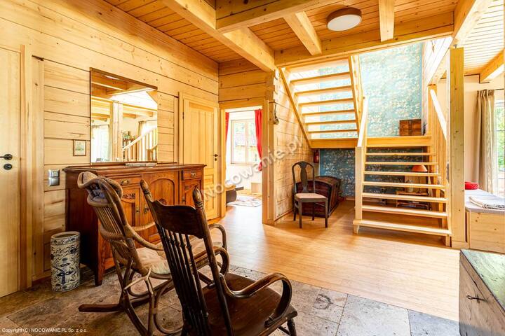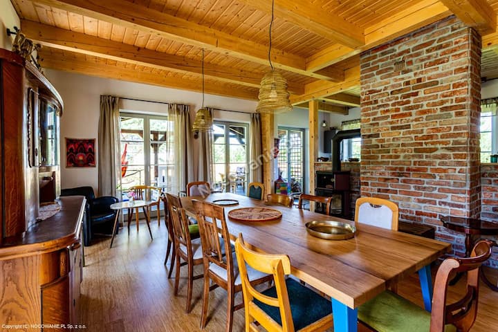 Das Blockhaus wurde aus Fichtenholz sowie teilweise aus Lärchen- und Kiefernholz aus nachhaltiger polnischer Forstkultur gebaut. Die Verwendung natürlicher Baumaterialien sorgt das ganze Jahr über für ein angenehmes Raumklima. Wir haben uns für eine hochwertige ökologische Wärmedämmung aus Holzwolle entschieden, die atmungsaktiv und besonders allergikerfreundlich ist. Im Erdgeschoss mit dem Natursteinboden gibt es eine Fußbodenheizung, im ersten Stock, wo Bambusdielen und Naturstein verlegt wurden, lässt sich im Winter die Temperatur über die Heizkörper regulieren. Pantoffeln sollten aber im Gepäck ebenso wenig fehlen wie wind- und wetterfeste Kleidung für deine Outdoor-Aktivitäten. „Dzika Róża“ ist ein Nichtraucherobjekt. Wir haben keinen Fernseher aber es gibt WLAN.