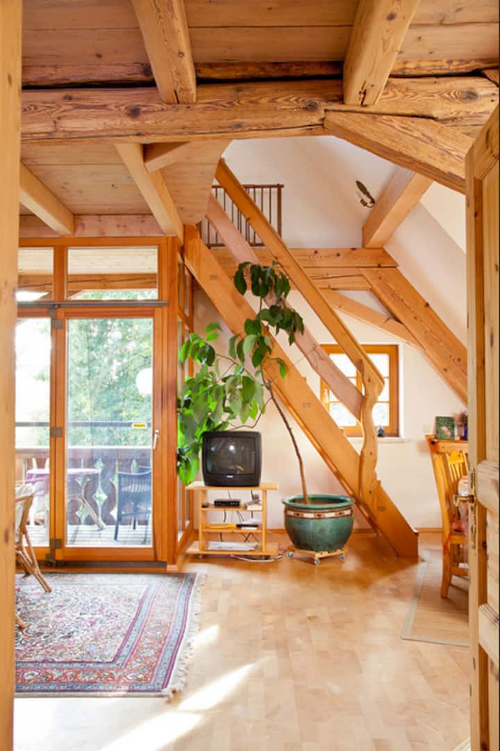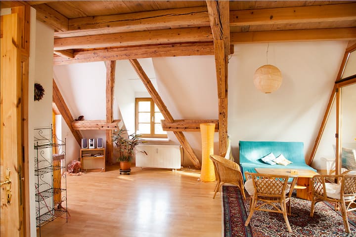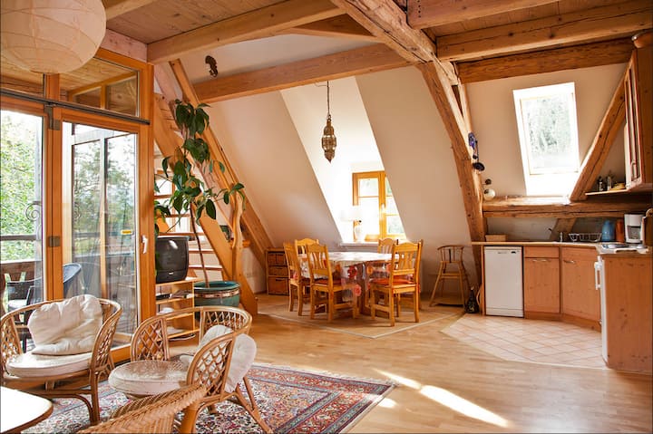 Die zwei Ferienwohnungen liegen in unserem Haus (unsere Wohnung ist im Erdgeschoss), die "kleine Wohnung" liegt im ersten Stock und die "große Wohnung" im zweiten Stock (ausgebauter Dachstuhl, wie auch im Inserat beschrieben).