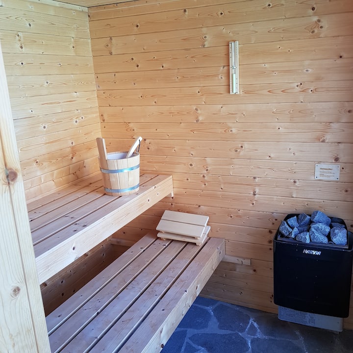 Entspanne dich mit dieser Ausstattung: Außendusche und Sauna.