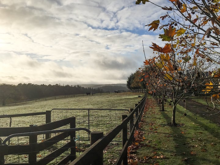 Es gibt einen kleinen Olivenhain und einen Obstgarten zu entdecken, mit offenen Paddocks dahinter, Heimat unserer freundlichen Schafe. Erkunde die privaten Buschwege in den 20 Hektar großen einheimischen Busch auf dem Grundstück und genieße es, die Melodien des einheimischen Vogelgesangs zu hören, während du spazieren gehst, darunter Kookaburras, Kakadus, Magpies und Lyrebirds. Vielleicht triffst du sogar einige der lokalen Wildtiere auf deiner Reise, wie Wallabys, Wombats und Kängurus.