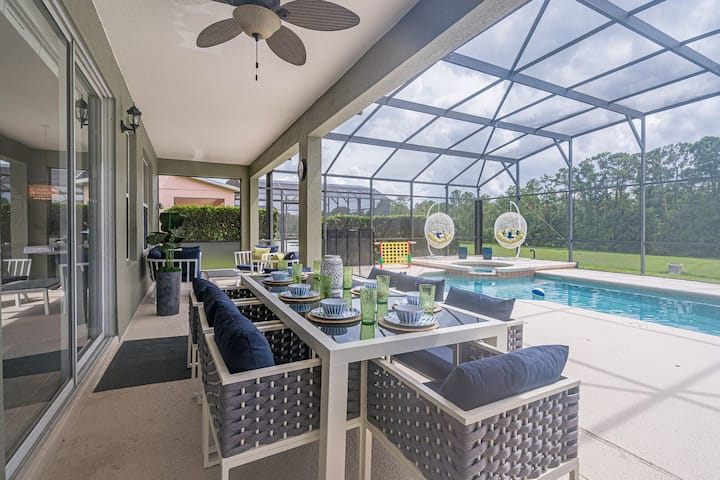 Atemberaubende, von Designer eingerichtete 7th Heaven Villa! Diese Unterkunft hat alles, was du, deine Familie oder Freunde jemals brauchen oder mehr und mehr! Das Walt Disney World Resort® ist nur zwei Ampeln entfernt. Dieses luxuriöse Poolhaus nach Süden verfügt über 7 Schlafzimmer, 6 Badezimmer und bietet bequem Platz für 15 Personen sowie Kleinkinder. Der private Pool und das Spa verfügen über einen großen, erweiterten Terrassenbereich um ihn herum und werden durch eine Veranda ergänzt, die etwas Schatten bietet. Alle Handtücher und Bettwäsche werden zur Verfügung gestellt.