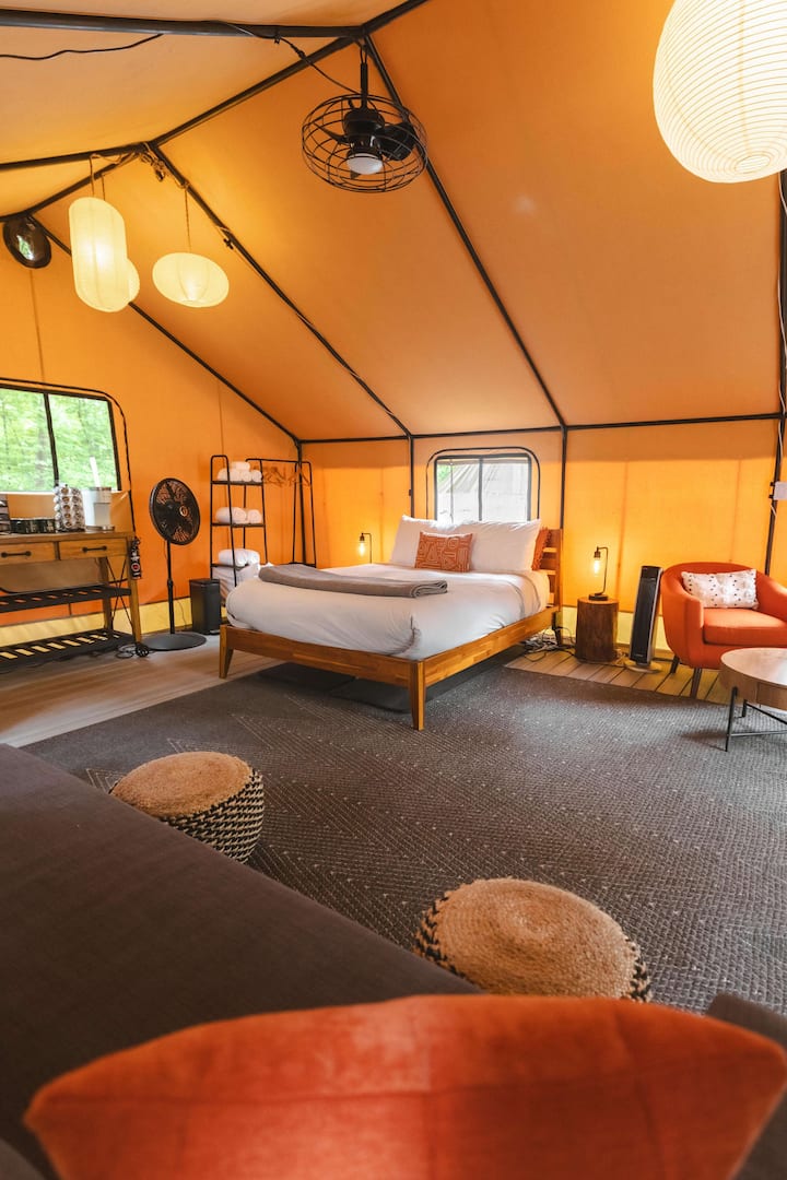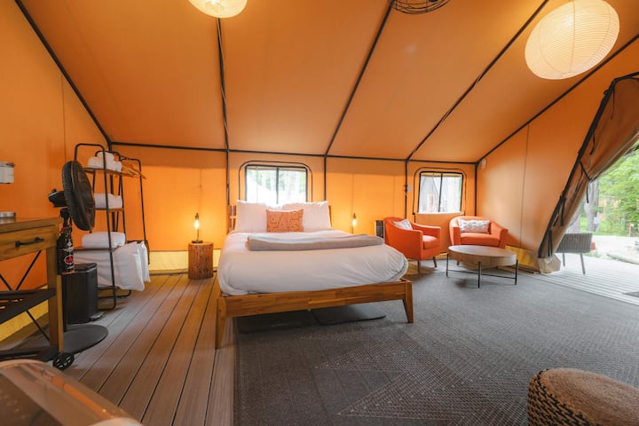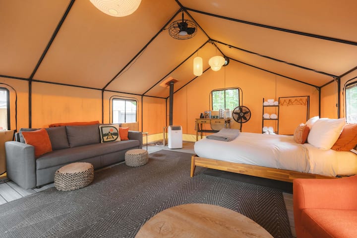 Unser Luxe-Zelt ist luxuriöses Camping vom Feinsten. Es verfügt über ein Queensize-Bett, ein unglaublich bequemes Queensize-Schlafsofa, Bettwäsche und Steppdecke oder Daunendecke, Kissen, zwei Schlafkissen auf dem Boden für Kinder oder harte Erwachsene, Ventilator, Kaffee/Tee, Handtücher, Strom und Lichter, Minikühlschrank, Holzofen, Kleider-Organizer und vieles mehr.