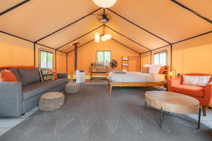Genieße ein luxuriöses Camping-Erlebnis im Freien! Schlafe in der Natur in unserem 16'x20' luxuriösen Glamping-Zelt mit Queensize-Bett, Queensize-Schlafsofa und einem Sitzbereich. In einem kürzlich renovierten Luxuscampingplatz mit hohen nördlichen Kiefern. Es verfügt über eine Veranda mit bequemen Stühlen und einen charmanten Außensitzplatz mit einem Feuerring, Bistro-Leuchten und Adirondack-Stühlen.