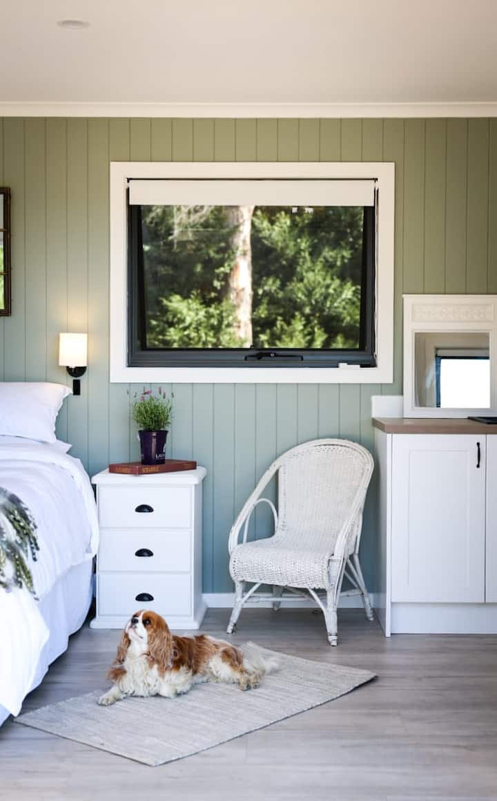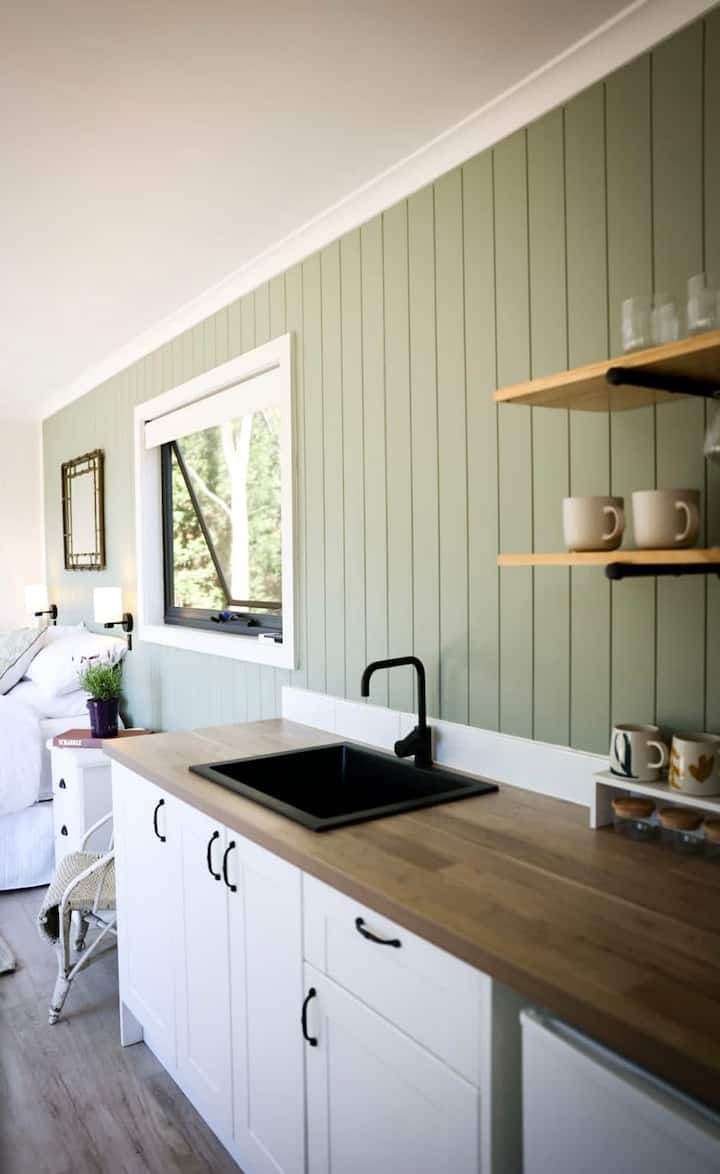 @littleburrow_cabinandcottage Ein entspannender Rückzugsort für Paare in diesem stilvollen Tiny House auf 6 friedlichen Hektar unseres Boutique-Reitgrundstücks, 2 km vom charmanten ländlichen Dorf Exeter mit seinem beliebten Café entfernt. Umgeben von kleinen Bauernhöfen und der Ruhe der Landschaft, während es nur eine Fahrt (Bundanoon 10 Minuten Mossvale 15 Minuten Fahrt) zu den charmanten Städten der Southern Highlands ist. Es ist besonders ruhig in der Nacht - genieße die Feuerstelle und das Außenbad, während du die Sterne betrachtest. Kleiner Hund freundlich