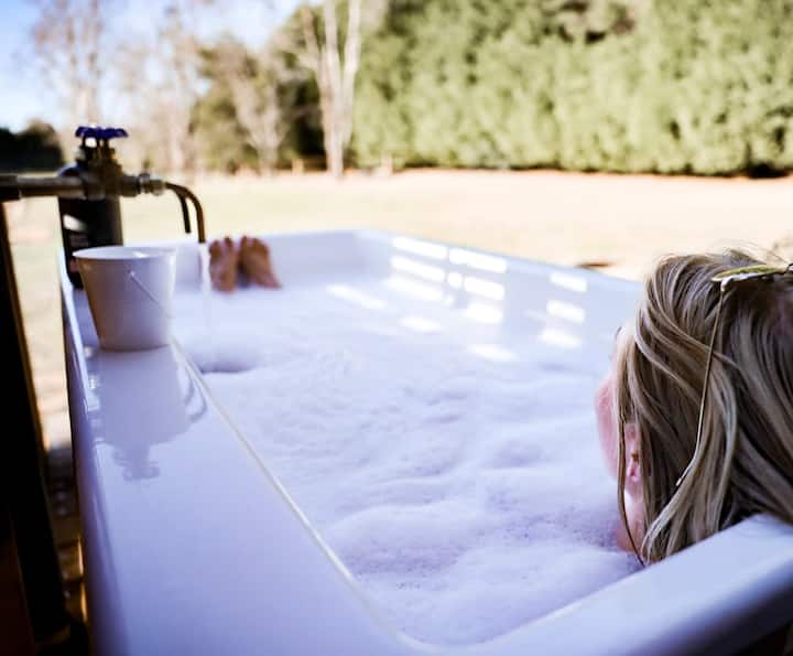 Genieße ein verwöhnendes Outdoor-Bad in der modernen Kohler-Außenwanne aus Gusseisen, die groß genug für zwei ist. Dann setze dich mit einem Glas von etwas, das du aus den vielen lokalen Weingütern der Gegend ausgewählt hast, an die Feuerstelle.