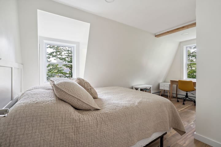 ✔ Schreibtisch & Stuhl im Queensize-Schlafzimmer im Obergeschoss mit schönem Blick auf die Bäume und den See