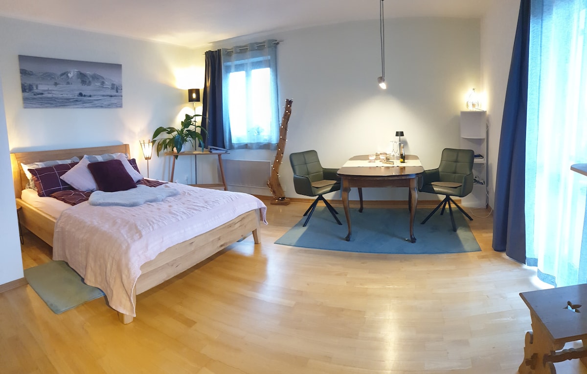 Meine Unterkunft ist ca 33 qm groß plus Balkon, sie befindet sich in der Nähe vom Ortszentrum und öffentlichen Verkehrsmitteln. Ihr werdet meine Unterkunft lieben: Bayerische Gemütlichkeit, ein komfortables Bett (140 x 200), eine gut ausgestattete Küche, der Kamin, ein großzügig überdachter Balkon, die Ruhe, natürlich die Berge und Seen... Mein geschmackvoll eingerichtetes Appartement ist ganzjährig ein romantischer Rückzugsort für Paare, Alleinreisende, Abenteurer und Geschäftsreisende.