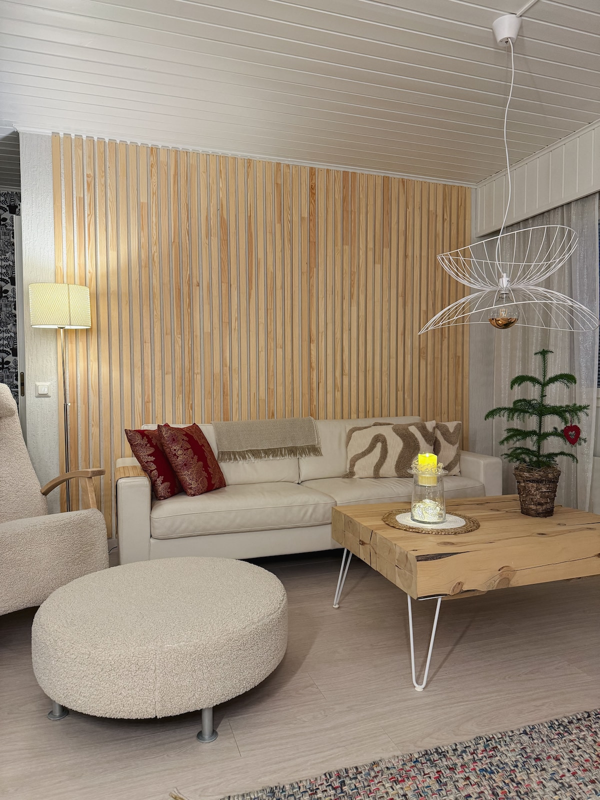 Relax in your private sauna in this fully renovated, modern apartment in the center. ★ "...clean, modern and beautifully decorated. Highly recommended!" ☞ Sauna & free parking. ☞ Fully equipped + stocked kitchen ☞ 65” Smart-TV & 500 MB wifi. ☞ Fully renovated. 》2min walk to shopping, restaurants, and arctic tours. 》3min walk to airport/Santa Claus shuttle bus. 》11min drive to Santa Claus Village and to ✈ airport 55m2 stylish home on the 1st floor –> no elevator. Book now before it’s gone!