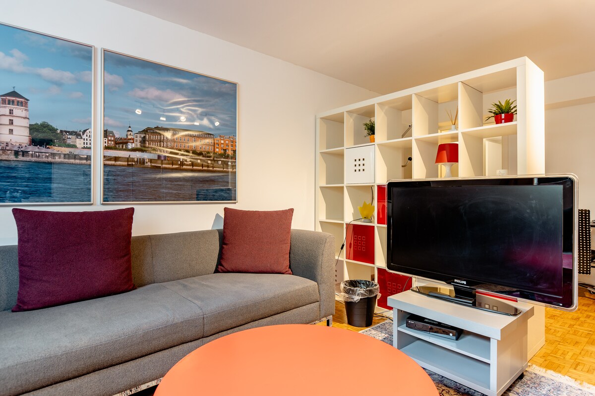 Das Appartement befindet sich auf der 4. Eage straßenseitig, mit Aufzug. Frisch saniert, alle Möbel sind neu und in einem Raum, moderne Kücheneinrichtung, Essplatz, Doppelbett, Schwebetürenschrank, ein geöltes Eichenparkett, eine vollflächige Verglasung, Jalousien als Sicht und Sonnenschutz, dahinter ein großer Balkon über die gesamte Breite. Das Appartement ist sehr hell und sonnig. Innenstadt, Altstadt, Rheinuferpromenade, Schauspielhaus und die Oper sind in wenigen Minuten zu Fuß erreichbar.