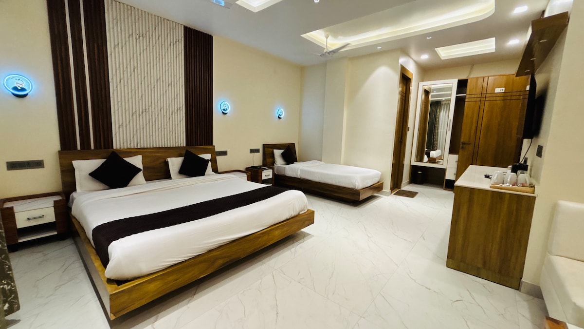 **Deluxe-Zimmer mit Kingsize-Bett | Sauber und komfortabel** Ein komfortables Deluxe-Zimmer mit einem Kingsize-Doppelbett, Klimaanlage und einem angeschlossenen eigenen Badezimmer. Geeignet für Paare oder kleine Familien, mit einer zusätzlichen Bodenmatratze auf Anfrage für einen zusätzlichen Gast. Inklusive Highspeed-WLAN, täglicher Reinigung, Notstromversorgung und Zugang zu den Gemeinschaftsbereichen. Ideal für Reisende, die einen sauberen, ruhigen und bequemen Aufenthalt in Haridwar suchen.