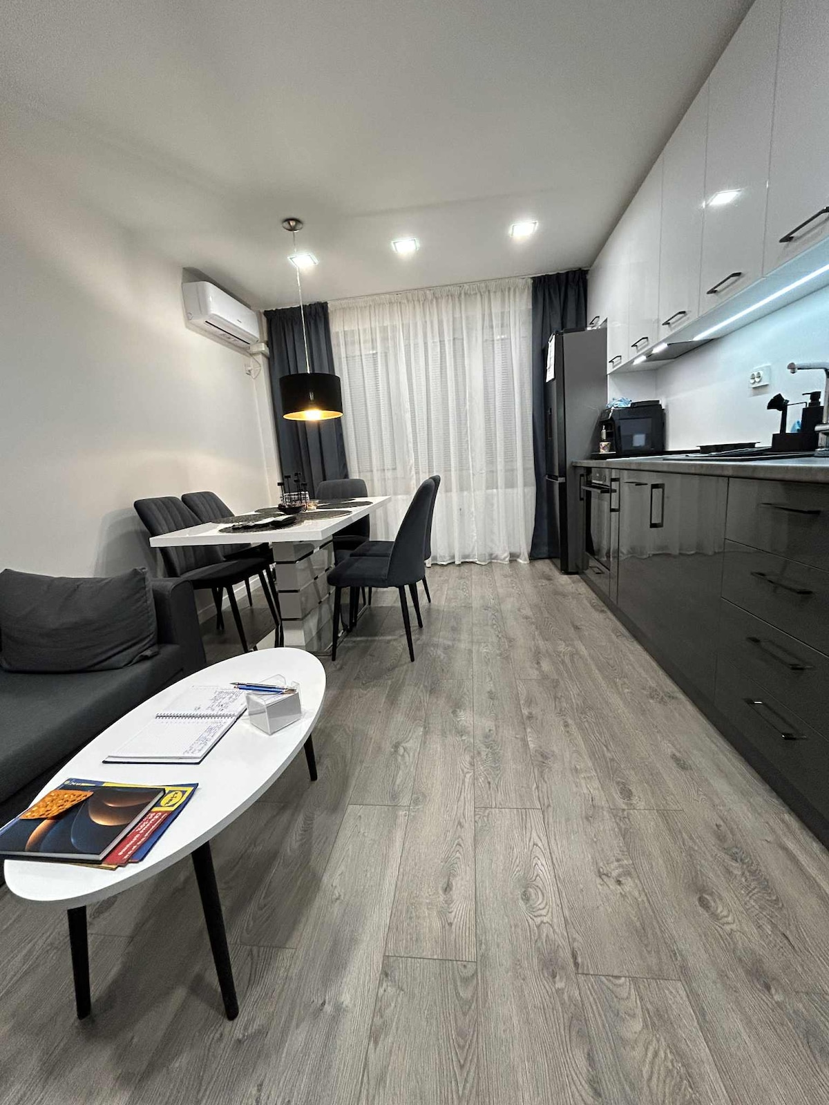 Brandneue, luxuriös eingerichtete Wohnung, Klimaanlage, geräumiges Wohnzimmer mit großem TV, Sitzecke mit bequemem Schlafsofa, Küche, Schlafzimmer mit TV und Terrasse sowie ein eigenes Bad. Die Küche ist vollständig ausgestattet und du möchtest vielleicht Mahlzeiten zubereiten oder warmen. Vom Wohnzimmer-Sofa aus kann man 55-Zoll-Fernseher genießen, ebenso wie kostenloses WLAN. Die Wohnung verfügt über einen Fön, Bügeleisen, Bügelbrett, Badetücher sind ebenfalls vorhanden.