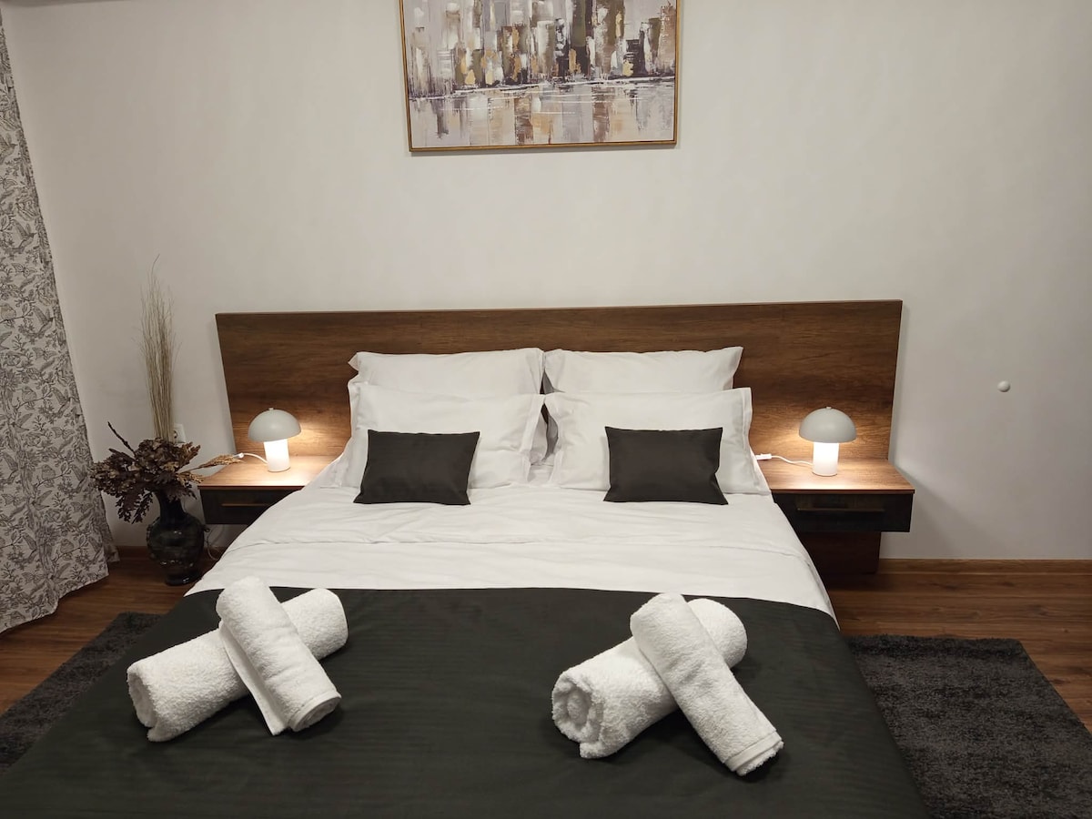 Wir präsentieren dir eine gemütliche und luxuriöse Gästewohnung Devio Char, die sich in einer ruhigen Gegend am Anfang der Stadt befindet. Für unsere Gäste bieten wir klimatisierte Einheiten mit einem Balkon und kostenfreiem WLAN, das mit riesigen SMART-TVS in jedem Zimmer ausgestattet ist. Das Apartment verfügt über zwei separate Schlafzimmer, ein geräumiges Wohnzimmer mit Schlafsofa und eine voll ausgestattete Küche. Der Block verfügt über einen großen öffentlichen Parkplatz. Kompliment an jeden unserer Gäste - Flasche Wein, Mineralwasser, Kaffee, Tee, Obst.