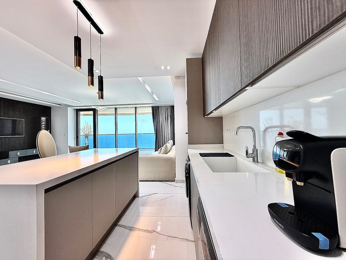 Wunderschöne neue, moderne und klimatisierte Wohnung mit herrlichem Blick auf das Meer, ohne Gegenüber. Das Hotel liegt in einer sicheren Residenz mit 24-Stunden-Hausmeister, Fitnessraum, Aufzug und eigenem Parkplatz. Sie verfügen über 2 komfortable Schlafzimmer, 2 moderne Badezimmer, eine voll ausgestattete Küche und ein helles Wohnzimmer, das sich zu einer Terrasse mit einem außergewöhnlichen Panorama öffnet. 50 m vom Strand entfernt, in der Nähe von Geschäften, Restaurants und Verkehrsmitteln. WLAN und moderne Ausstattung.