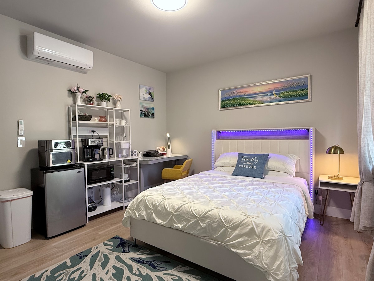 Diese luxuriöse private Suite, die 2024 erbaut wurde, verfügt über einen eigenen Eingang und befindet sich auf einer separaten Etage. Sie befindet sich in idealer Lage im Viertel West Bellevue, nur eine Meile von der Innenstadt von Bellevue entfernt. Es verfügt über eine Zimmerbar, ein komplettes eigenes Bad und moderne Annehmlichkeiten wie Highspeed-WLAN, eine Küchenzeile mit Kühlschrank, Mikrowelle und Kaffeemaschine sowie eine Klimaanlage - perfekt für den Sommer. Genieße einen angenehmen Aufenthalt in dieser frischen und privaten Unterkunft.