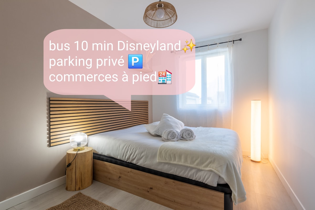 Maisonette-Wohnung nur wenige Minuten von Disneyland entfernt, 10 Minuten mit dem Bus, 20 Minuten zu Fuß, 5 Minuten mit Uber, RER Paris, Supermarkt Super U 100 m von der Unterkunft entfernt! • 2 Schlafzimmer, 2 Betten (180 und 140 cm) für 4 Reisende + Babybett + Schlafsofa für 2 Personen im Erdgeschoss (Bettwäsche inklusive) • Voll ausgestattete Küche mit allem, was Sie brauchen, um Ihre Mahlzeiten zuzubereiten, Kaffee , Tee inklusive . • Badezimmer und Handtücher inklusive . • WLAN / Netflix • Terrasse mit Blick auf das Feuerwerk von Disney.