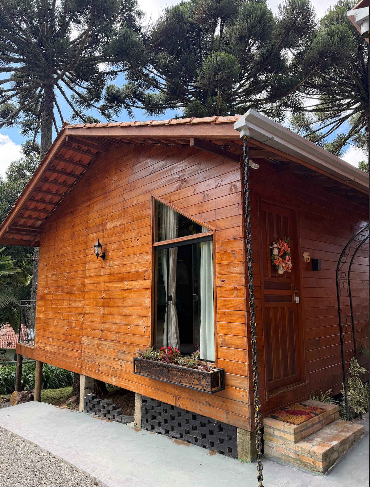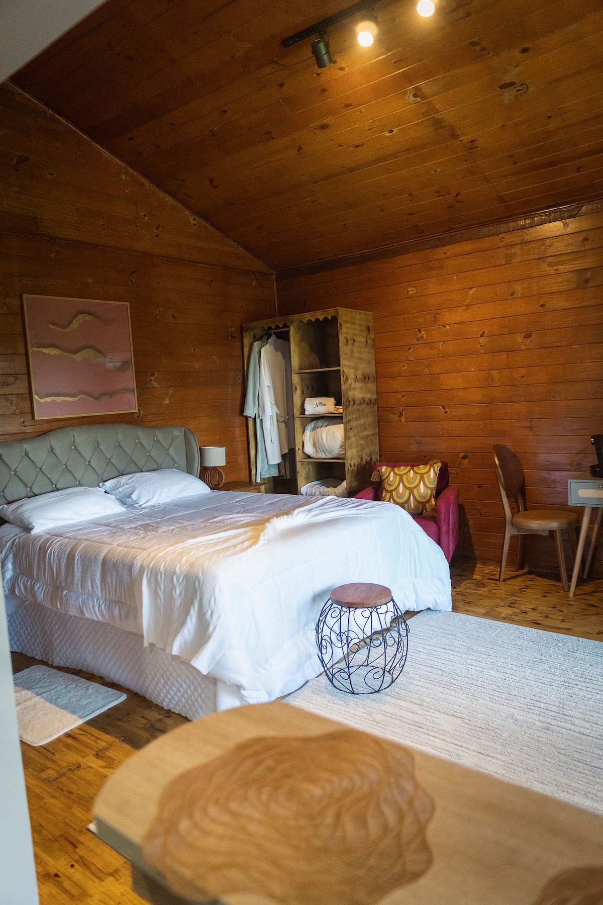 Conforto em meio à natureza Aconchegante e funcional, o Chalé N1 é ideal para quem busca descanso e tranquilidade. Conta com cama de casal, banheiro privativo, roupa de cama e toalhas, além de uma copa equipada com frigobar, micro-ondas, chaleira e utensílios básicos. Com ambiente em madeira e iluminação natural, proporciona uma experiência acolhedora, perfeita para desacelerar e se conectar com a natureza.