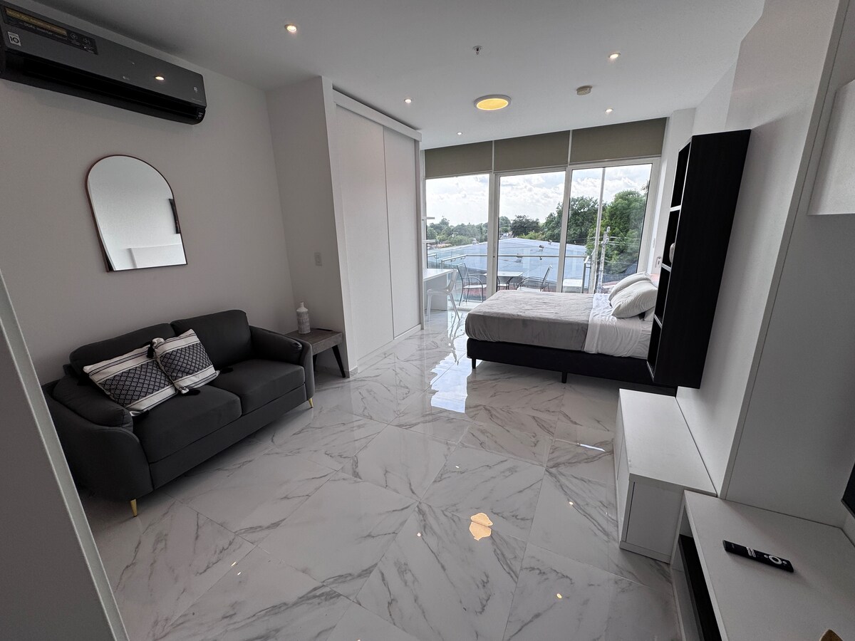 Willkommen in Escape mit Panoramablick, einer modernen und gemütlichen Wohnung im Santa Cruz Tower, David. Genieße einen spektakulären Blick vom Balkon, Queensize-Bett, Klimaanlage, Schreibtisch, WLAN, ein eigenes Bad und heißes Wasser. Das Hotel liegt in einer ruhigen Gegend, aber nur wenige Minuten von Einkaufszentren wie der Federal Mall und der Plaza Terronal, Restaurants, Supermärkten und Geschäften entfernt. Darüber hinaus hat es direkten Zugang zu Boquete, Chiriquís beliebtestem Bergziel. Englisch oder Spanisch!