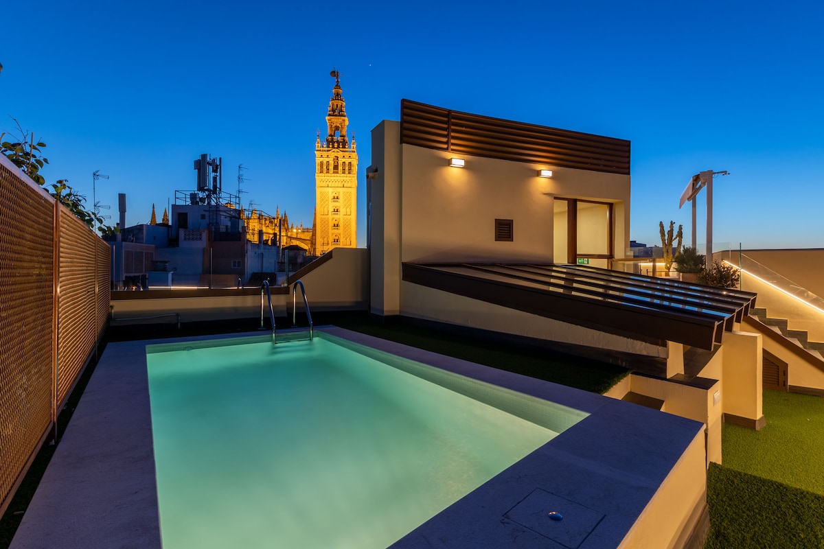 Wunderschönes Penthouse in einem kürzlich gebauten Gebäude mit den hochwertigsten Oberflächen, mit zwei privaten Terrassen mit privilegiertem Blick auf die Kathedrale. Das Hotel liegt im Herzen von Sevilla, nur wenige Meter von der Kathedrale, Giralda und dem Rest der Denkmäler der Stadt entfernt. Die Wohnung ist ein sehr geräumiges Studio mit einem Queensize-Bett, einem Wohn-Esszimmer, einer Terrasse mit einem Essbereich im Freien und einer weiteren Terrasse mit einem Sofa, einer Dusche und Sonnenliegen. Die Aussicht ist unschlagbar.