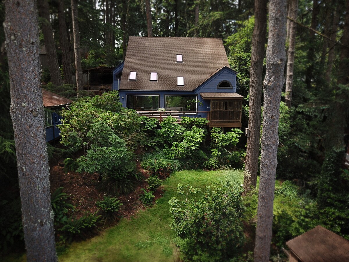 Ruhe, Privatsphäre und Komfort in den exklusiven Eugene South Hills. Eingebettet in die Baumkronen und doch nur wenige Minuten vom U of Oregon/der Innenstadt/der I-5 entfernt, verfügt diese 3-stöckige, über 90 Quadratmeter große Suite über einen eigenen Eingang, Fensterwände, einen Holzofen, einen Whirlpool im Freien, ein Kingsize-Bett, WLAN, Kabel-/Netflix, Self-Check-in/Check-out, schlüssellosen Zugang, eine neue schachtlose Klimaanlage und eine Masseurin. Dies ist die Nummer1 auf Airbnb in Eugene, die für Flitterwochen, Kurzurlaube und ein Musikvideo verwendet wird.