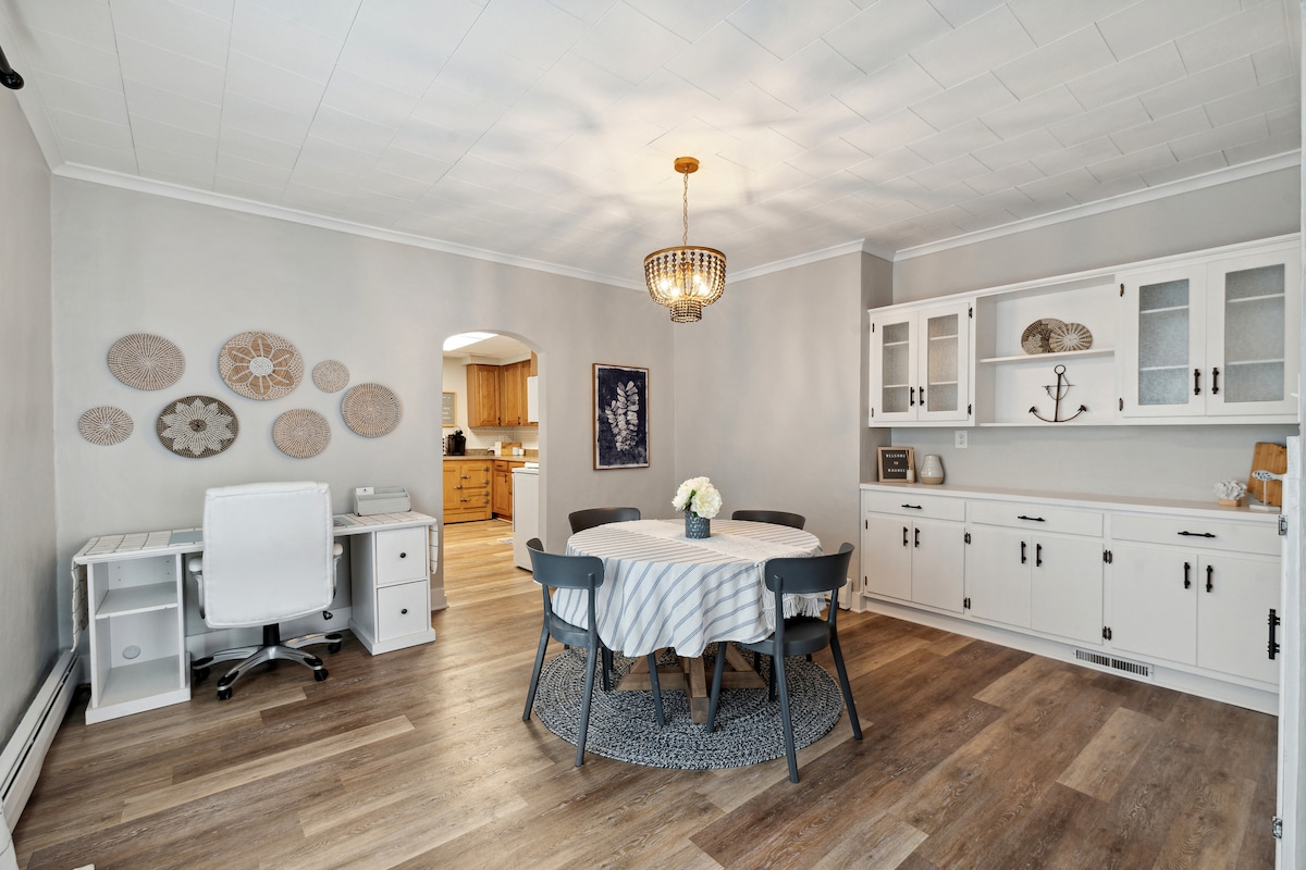 Bauernhausstil im Überfluss in diesem GROSSEN Haus mit 3 Schlafzimmern und 1,5 Bädern, das stolz im Uptown Maumee Dora District liegt und zu allem, einschließlich des Maumee River, begehbar ist! Wir begrüßen den Walleye Run Fisherman für die Saison '26! Der blaue Themenraum verfügt über schnelles WLAN, eine übergroße Küche mit Geschirrspüler und Kühlschrank, einen 55-Zoll-Smart-TV, ein Badezimmer im 1. Stock, einen eigenen Arbeitsbereich und eine Keurig-Kaffeemaschine. Im Obergeschoss befinden sich 3 private Betten sowie das komplette Badezimmer. Kingsize-Bett, Queensize-Bett, zwei Einzelbetten. Auch eine voll ausgestattete Waschmaschine/ein Trockner! Dein zweites Zuhause!