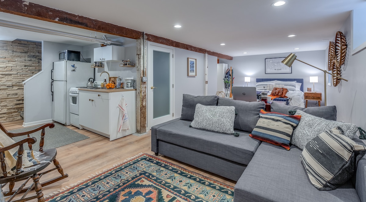 Erkunde das historische Viertel West 7th ganz bequem von diesem zentral gelegenen privaten Kellerstudio aus. Du bist nur 15 Gehminuten von der Innenstadt von St. Paul und dem Xcel Energy Center entfernt und von Brauereien, Restaurants, Cafés usw. umgeben. KOSTENLOSE Parkplätze auf der Straße direkt vor dem Haus! Ausgestattet mit Snacks, Getränken, Annehmlichkeiten und durchdachten Details! HINWEIS: Der Eingang befindet sich in unserem Garten. Du musst eine Reihe von 7 ziemlich schmalen, steilen Stufen hinuntergehen.
