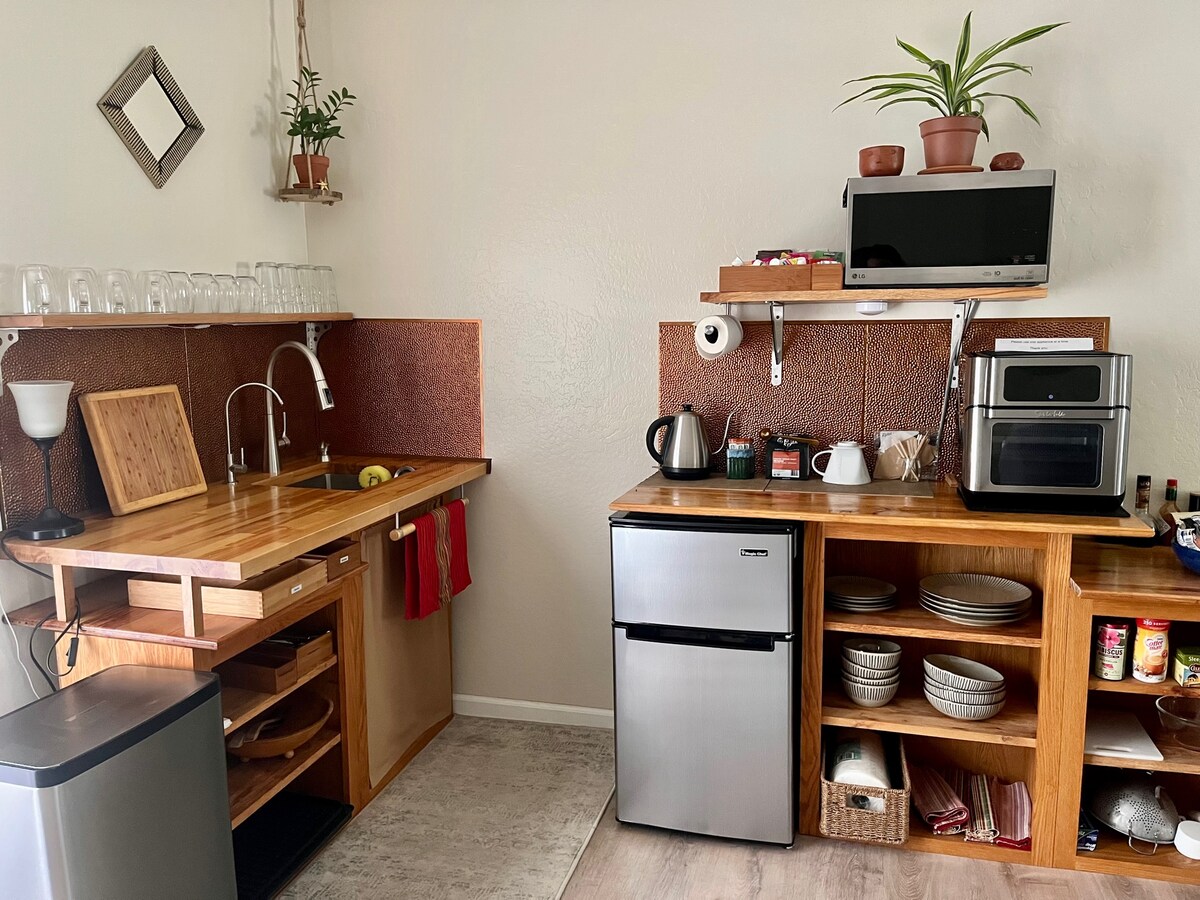 Gästesuite am Haupthaus mit separatem Eingang. Französische Türen öffnen sich zum großen Innenhof. Gut beleuchteter Eingang und Wohnbereich. Die Küchenzeile verfügt über einen Kühlschrank, ein elektrisches tragbares Induktionskochfeld, eine Mikrowelle, Pfannen, Besteck und Geschirr. Wasserfiltersystem für das ganze Haus. Großes Badezimmer mit ebenerdiger Dusche. Luftmatratze, falls für zusätzliche Gäste benötigt. Großer, umzäunter Garten, gut für Hunde. Zehn Minuten zur Landeshauptstadt, CSUS, und fünf Minuten zum UC Davis Medical Center.