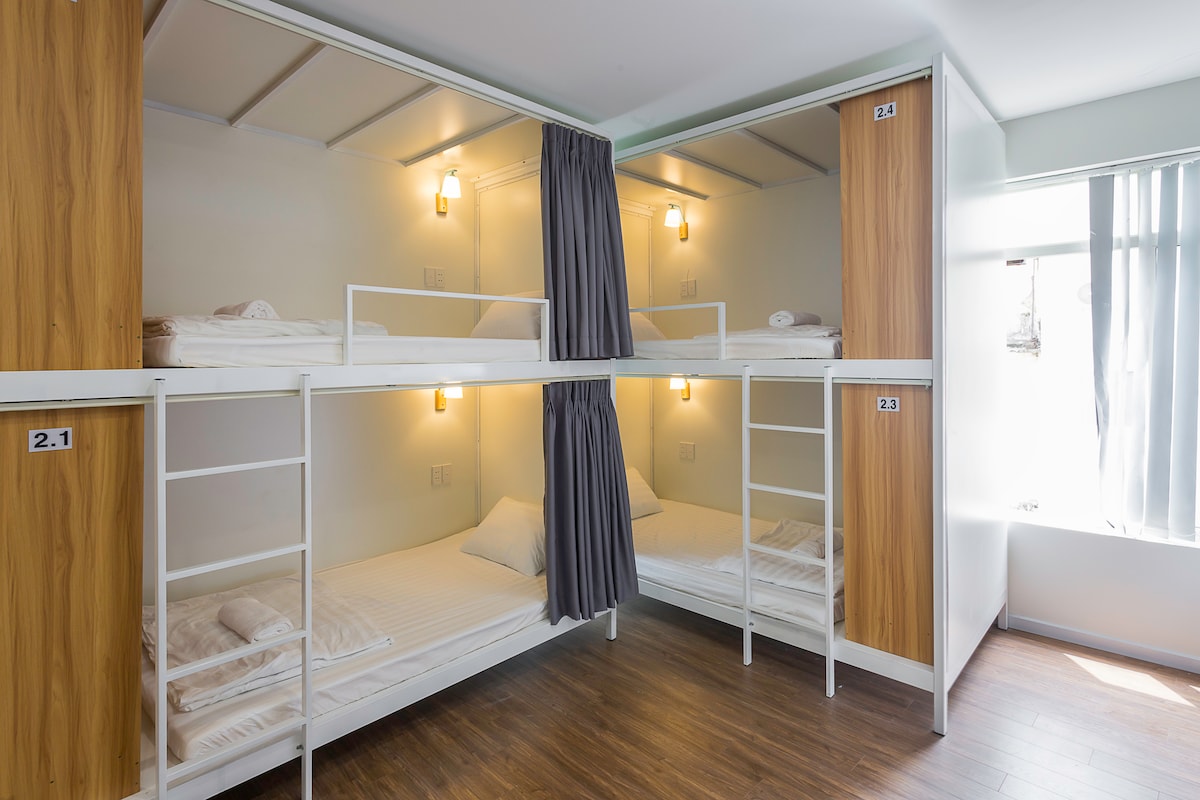 Bright and cozy bunk room for 10 people in District 1. Each bunk bed comes with curtain and personal wardrobe for privacy. This lovely space is great for friends and family who want to spend time for a quality and peaceful stay at the heart of HCMC.
