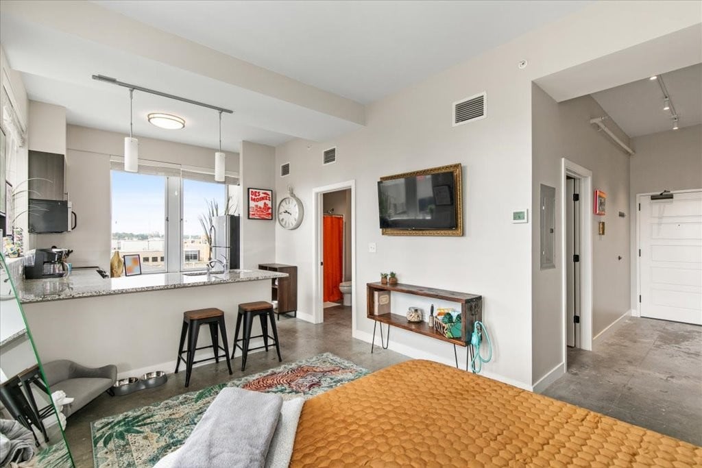 Entdecke das Herz von Des Moines in dieser pulsierenden Innenstadt auf Airbnb! Eingebettet in die beste Lage, nur wenige Schritte vom Nachtleben, historischen Sehenswürdigkeiten, Lebensmitteln, vielfältigen Restaurants und lebhaften Bars entfernt. - Kingsize-Doppelbett-Loft - 12,5 Fuß hohe Decken - Zu Fuß zur Wells Fargo Arena - Zum Science Center gehen - Privater Balkon - Restaurants, Bars, Nachtleben und Cafés in der Nähe - Voll ausgestattete Küche - Kostenloser Parkplatz inklusive - 65-Zoll-Smart-TV und Roku - Zusatzbett
