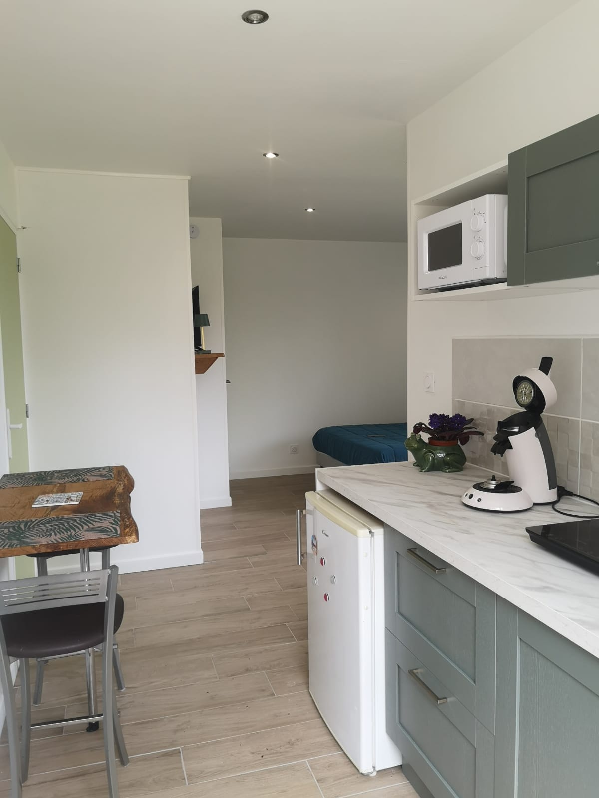 Studio im Obergeschoss von 40 m2 eingerichtet mit einer ausgestatteten Küchenzeile (Mini-Ofen, Mikrowelle, Wasserkocher und Toaster , einer Sitzecke mit einem Schlafsofa, Bad WC. Im Zwischengeschoss ein Schlafzimmer mit Doppelbett. Den Gästen steht neben der kleinen Terrasse neben dem Studio eine Gartenecke zur Verfügung. Dieses Studio befindet sich im Dorf Tinténiac in ruhiger Lage und 300 Meter von den Geschäften, 300 Meter vom Canal Ille et Rance entfernt. Frühstück gegen Aufpreis für 6€/Pers.
