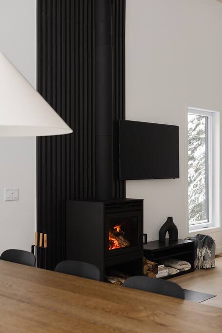 Unser nordisches Waldchalet ist perfekt geeignet, um Zeit zu zweit (oder mit einem Kind) oder für ein Work-Retreat (mit Highspeed-WLAN) zu verbringen. Das Holzinterieur ist warm und gemütlich. Die Fenster in voller Höhe bieten einen atemberaubenden Blick über ein bewaldetes Tal. Die offene Küche und das Wohnzimmer halten dich beim Kochen im Gespräch. Wenn du lieber draußen kochen möchtest, gibt es eine Feuerschale mit Grill und Esstisch im Freien. Nur 70 Fahrminuten von Montreal entfernt. Der See ist 25 Gehminuten entfernt, wenn du in der Nähe parkst.
