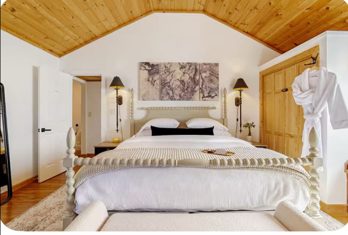 Reise in die Vergangenheit, wenn du die George Washington Suite im ersten Stock in diesem historischen Haus aus dem Jahr 1790 in Baldwinsville, NY, betrittst. Historische Möbel, gemischt mit modernen Annehmlichkeiten, sorgen für einen luxuriösen Aufenthalt. Parke direkt vor deiner Suite und deinem privaten Vordereingang. Gehe von deinem Wohnzimmer aus auf die große, mit Säulen versehene Veranda und schlendere durch die ruhigen Gärten. Genieße deinen Morgenkaffee auf der Terrasse neben dem Brunnen oder unter der Pergola, während du die Gasfeuerstelle genießt.