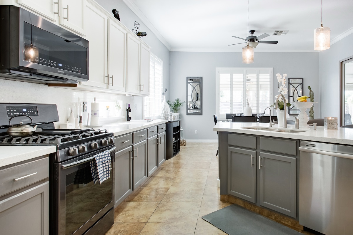 Zünde den Grill an und speise im Freien auf der überdachten Terrasse am Pool. Klassische Möbel, elegantes Dekor und eine Farbpalette aus tiefen Blautönen und Grautönen vermischen sich in diesem ruhigen Zuhause, um den idealen Raum zum Auftanken und Zeit mit den Liebsten zu schaffen. In der Nähe von Einkaufsmöglichkeiten, einfacher Zugang zum Highway 10 und Highway 303. Auch in der Nähe aller West Valley Spring Training Einrichtungen. Du hast Zugang zum gesamten Haus. Die Einfahrt bietet Platz für 3 bis 4 Fahrzeuge. Garage und Büro werden verschlossen sein. Einfacher Zugang per SMS, Telefon oder E-Mail. Wenn ich nicht in der Stadt bin, habe ich einen Co-Gastgeber rund um die Uhr zur Verfügung. Die Unterkunft befindet sich in einem ruhigen Wohnviertel mit Zugang zu Wanderwegen in der Nähe. Uber ist das beste Transportmittel, wenn nötig. Du kannst zu Fuß zu Target, World Market, Restaurants usw. gehen. Wir haben einen abgeschlossenen Pool. Es ist erforderlich, dass kein Kind den Poolbereich ohne Aufsicht betritt. Wenn du mit kleinen Kindern reist, informiere uns bitte. Wir werden dir erlauben, zu bleiben, aber bitte denke daran und beaufsichtige sie entsprechend. Kinder dürfen den Hinterhof auch nicht ohne Aufsicht eines Erwachsenen betreten. Unser Pool ist nicht beheizt, bekommt aber viel Sonnenlicht.