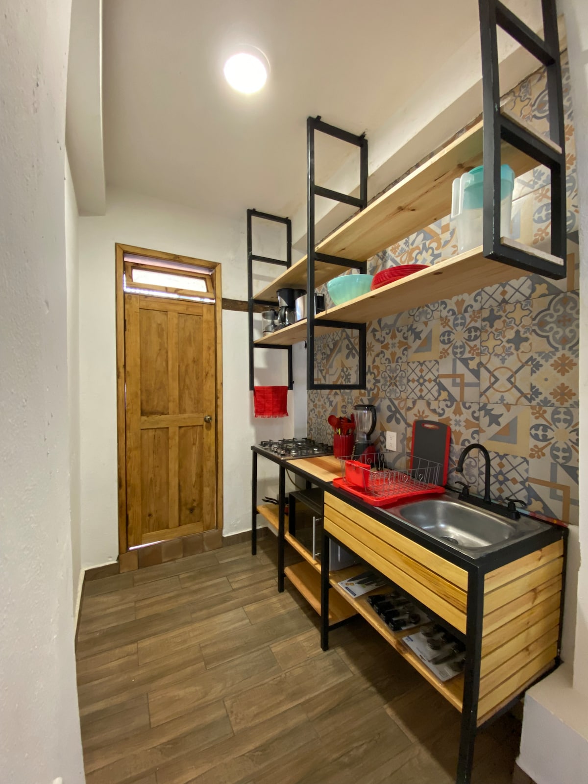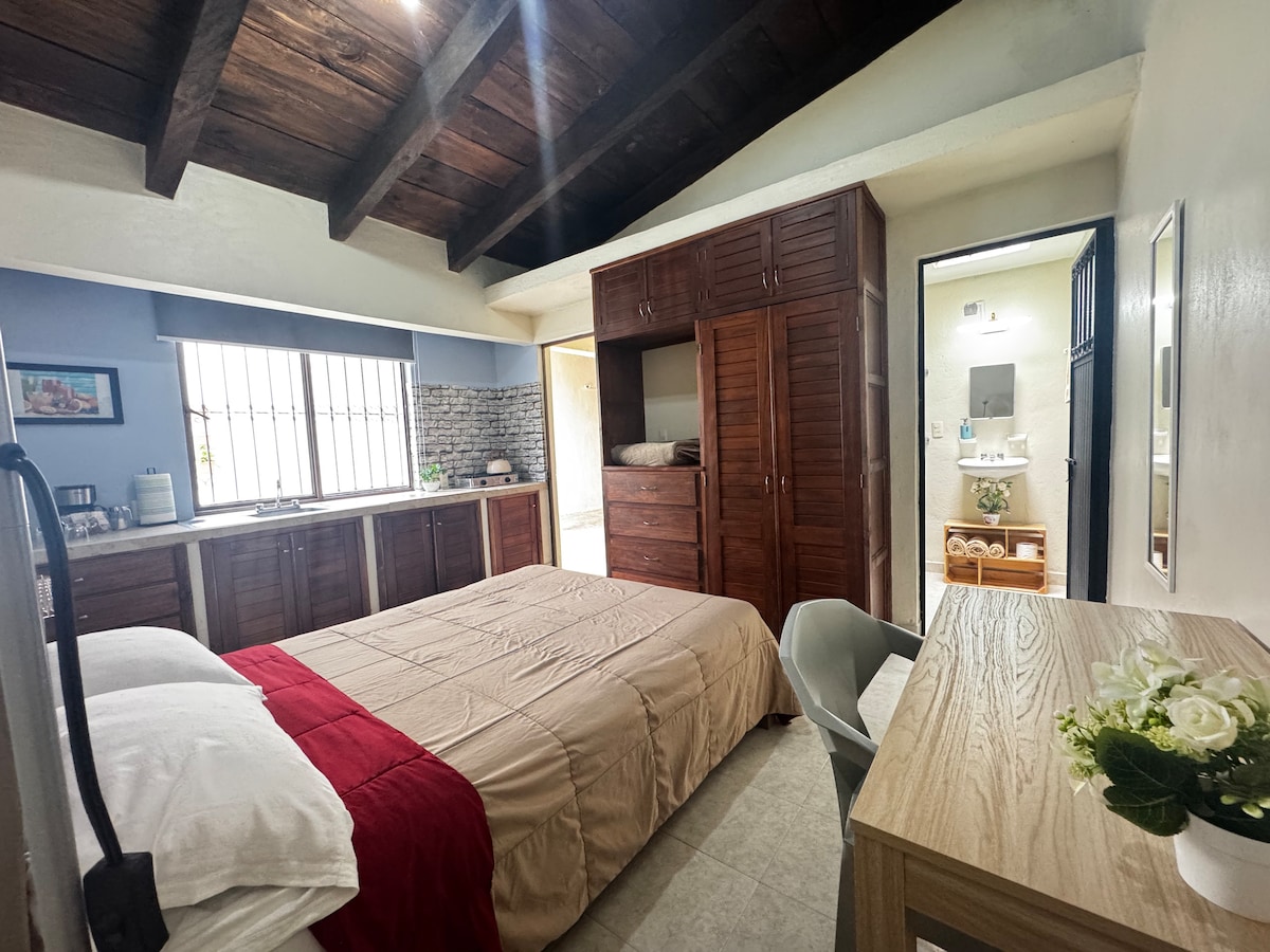 Gemütliche Einzimmerwohnung, geeignet für die Arbeit von zu Hause aus. Sauber und desinfiziert. Ein Schlafzimmer mit Doppelbett und Smart-TV und gutem WLAN-Signal. Wohnzimmer mit zwei Einzelbetten, mit Kamin (Brennholz wird separat berechnet). Esszimmer, ausgestattete Küche und Bad mit Dusche und heißem Wasser. Eine einzige und private Tür zur Straße. Im Zentrum von San Cristóbal im Viertel Cerrillo, 5 Blocks vom lokalen Markt entfernt.